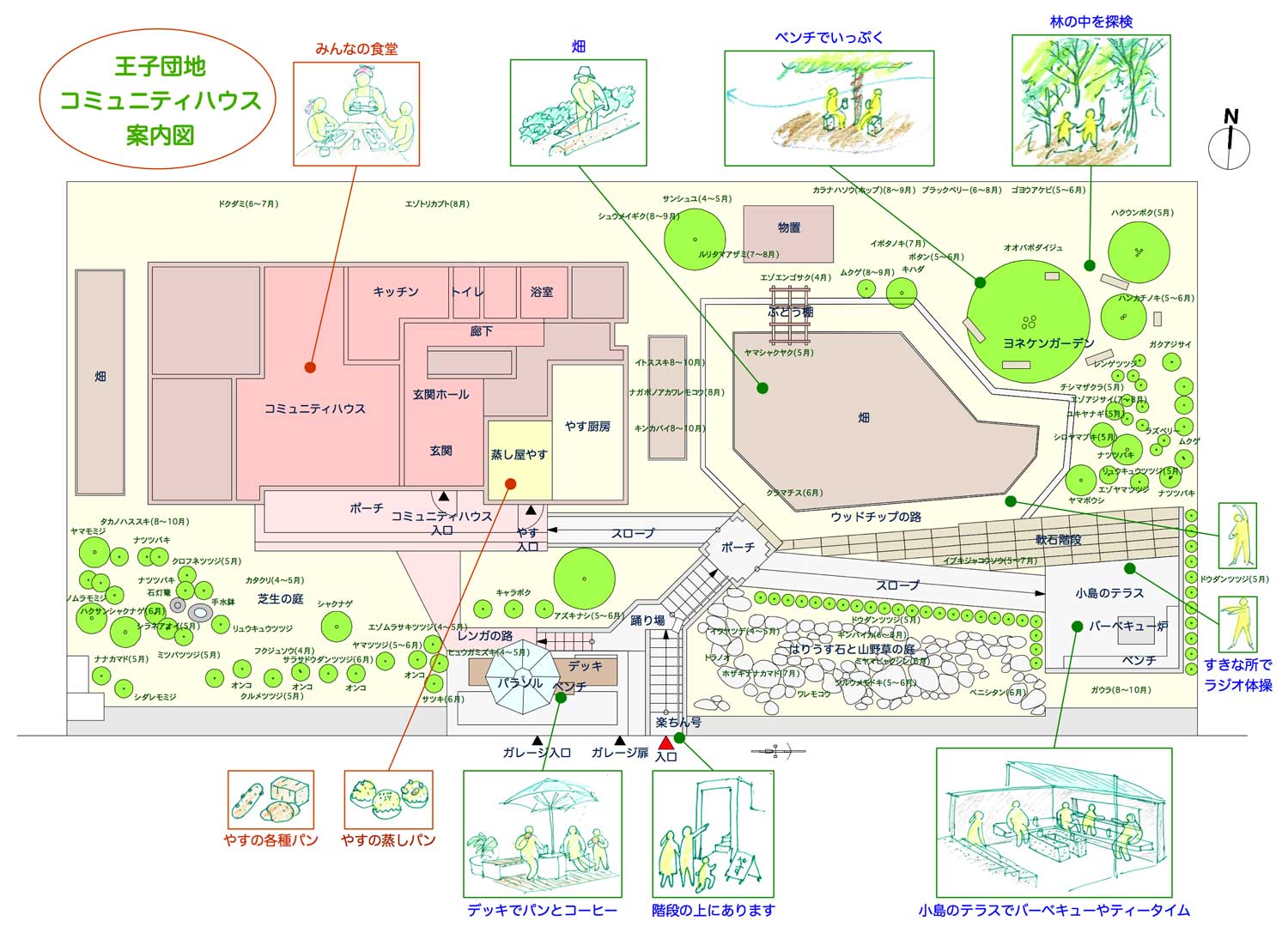 「みっちゃん」でできること お一人おひとりが、施設を利用して自由に創造、組み立て、運営してください。例えばワークショップや子どもを集めての英会話教室、自作のアクセサリーショップ、ヨガ教室や茶飲みサロンなどいかがですか? ↑クリックで拡大 人と人が向き合い、言葉を交わし心を通じ合う「出会いの場」です コミュニティハウスの1階はリビングと食堂、キッチンが用意されています。調理器具や食器も使うことができます。すでに「子ども&シルバー食堂」がボランティアスタッフによって、月に一度運営されています。 使い方いろいろ 思い思いに楽しむ場所 リビング交流や遊びの場としてお使いください。 ・おしゃべり会 ・囲碁将棋 ・会議室 ダイニング食堂やカフェとしてお使いください。 冷暖房完備。お隣のリビングと一緒に広く使えます。 キッチン調理器具や食器もそろっています。IHコンロなので、安全にお使いいただけます。 ご利用料金 みっちゃんの部屋(リビング・食堂等) 2時間以内・・・無料2時間以上・・・50円/1人入浴・・・50円 屋外バーベキュー炉 1グループ・・・100円 設備機器 ・階段昇降機(無料)・コピー機1枚5円(白黒のみ) ・シュレッダー・救急箱 施設の予約 初めて利用される方は登録が必要です。詳細はご連絡ください。 庭の畑 建物横の敷地内には畑があります。収穫物は、子ども食堂の食卓にのぼります。畑管理はボランティアで。お手伝いできる方を募集中です。 蒸し屋「やす」(新たなタブが開きます) 建物内には蒸しパンと食パンなどのショップが併設されています。屋外デッキやテラスでお召し上がりいただけます。 ©みっちゃん All rights Reserved. Top